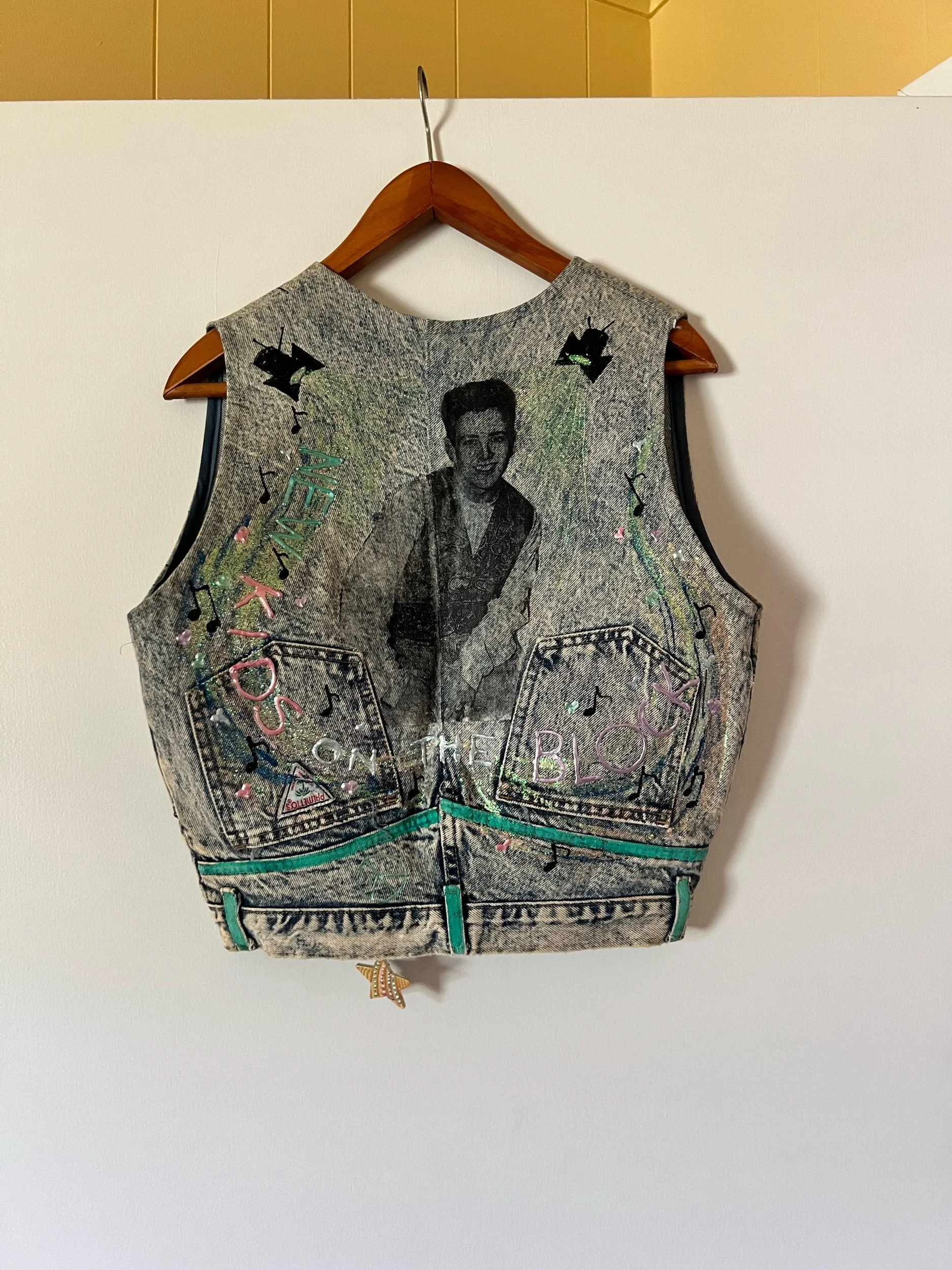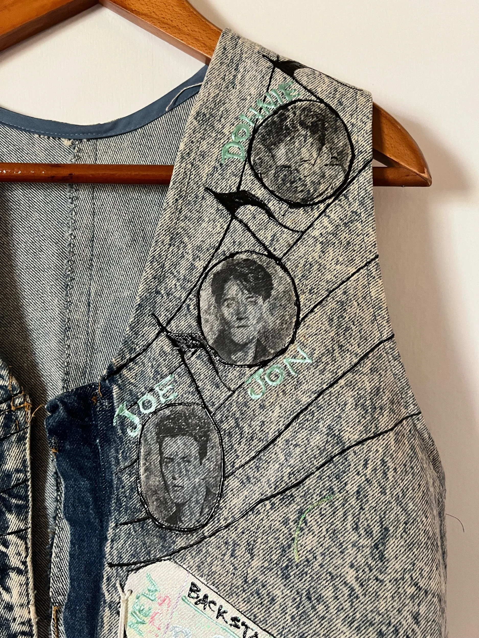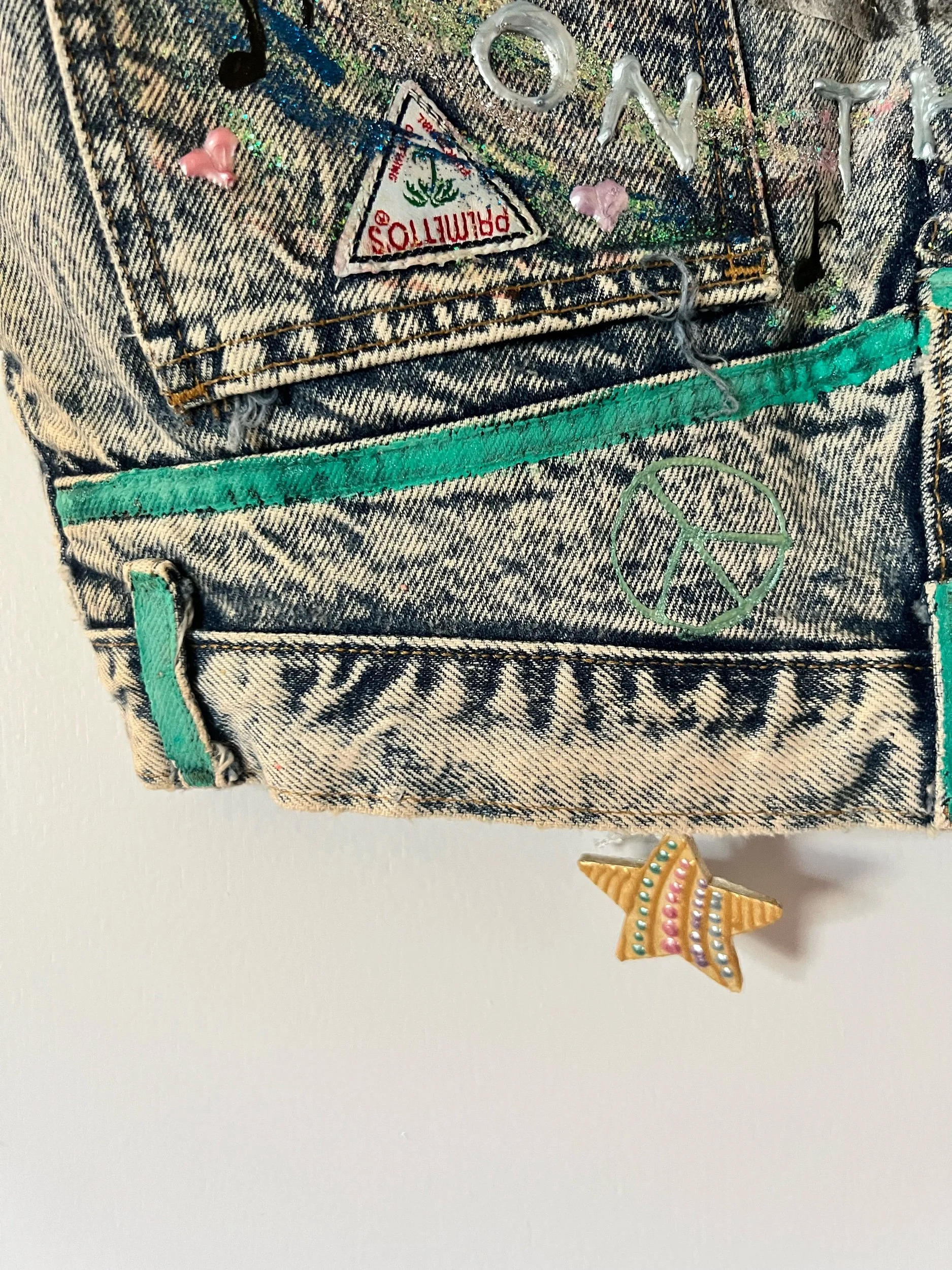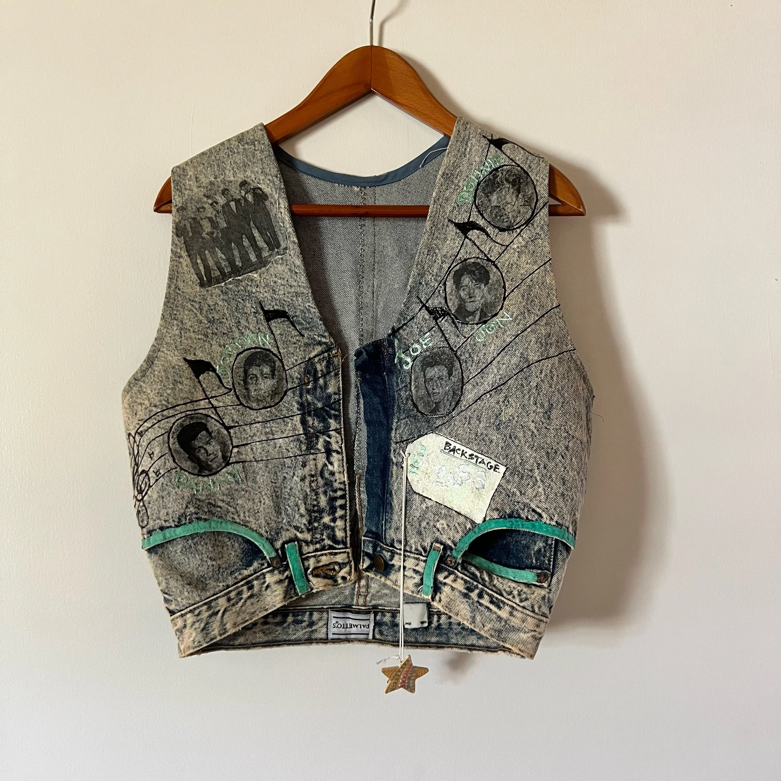 True 80s vintage Palmettos jeans were repurposed by a mega fan to make this incredible vest. Best for a modern M, but check measurements for your desired fit.