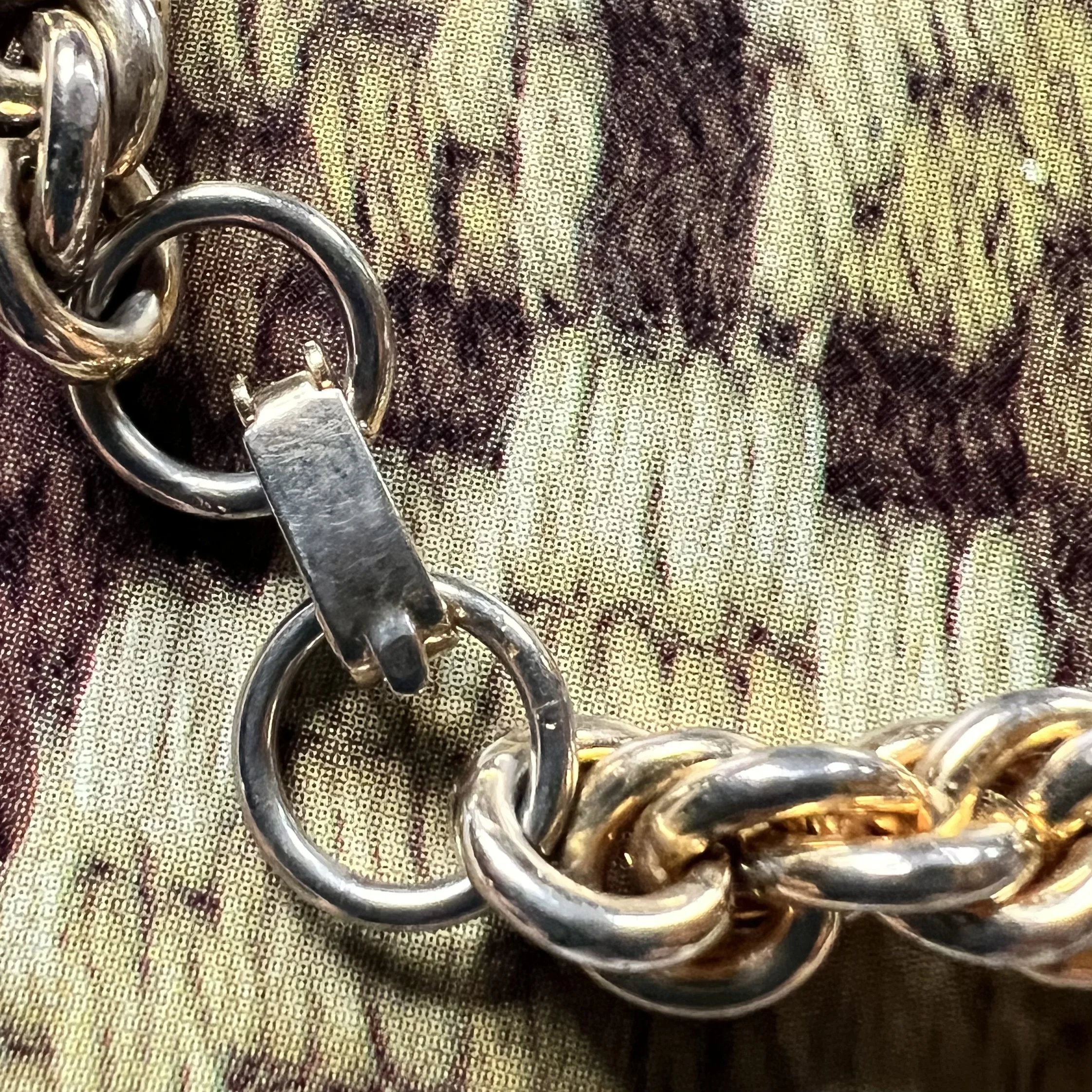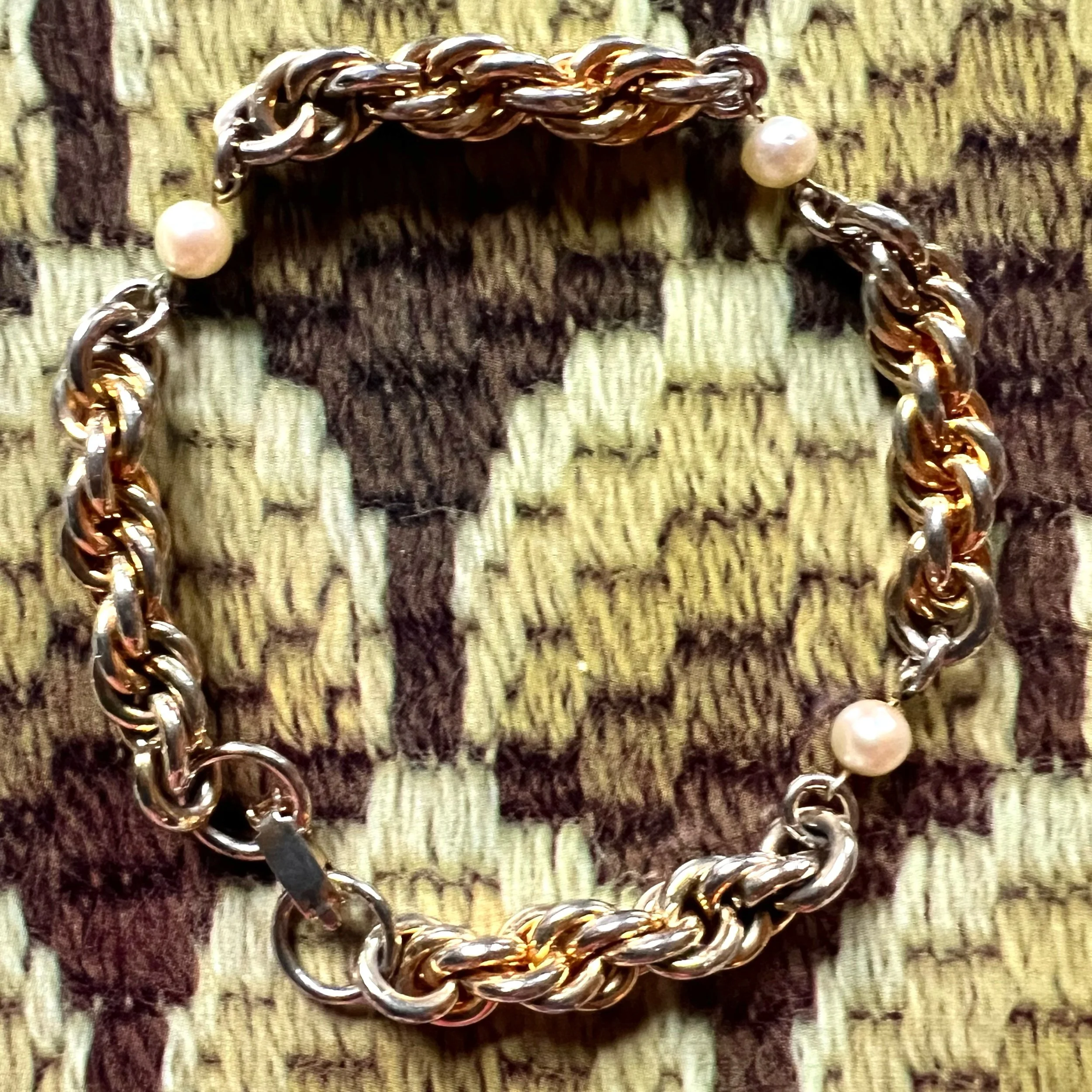 Classic midcentury costume jewelry design, featuring gold tone chain maille adorned with small faux pearl beads, secured with a fold-over clasp. There is some rubbing off of the gold, which is visible in the photos - adds to its charm and vintage patina.