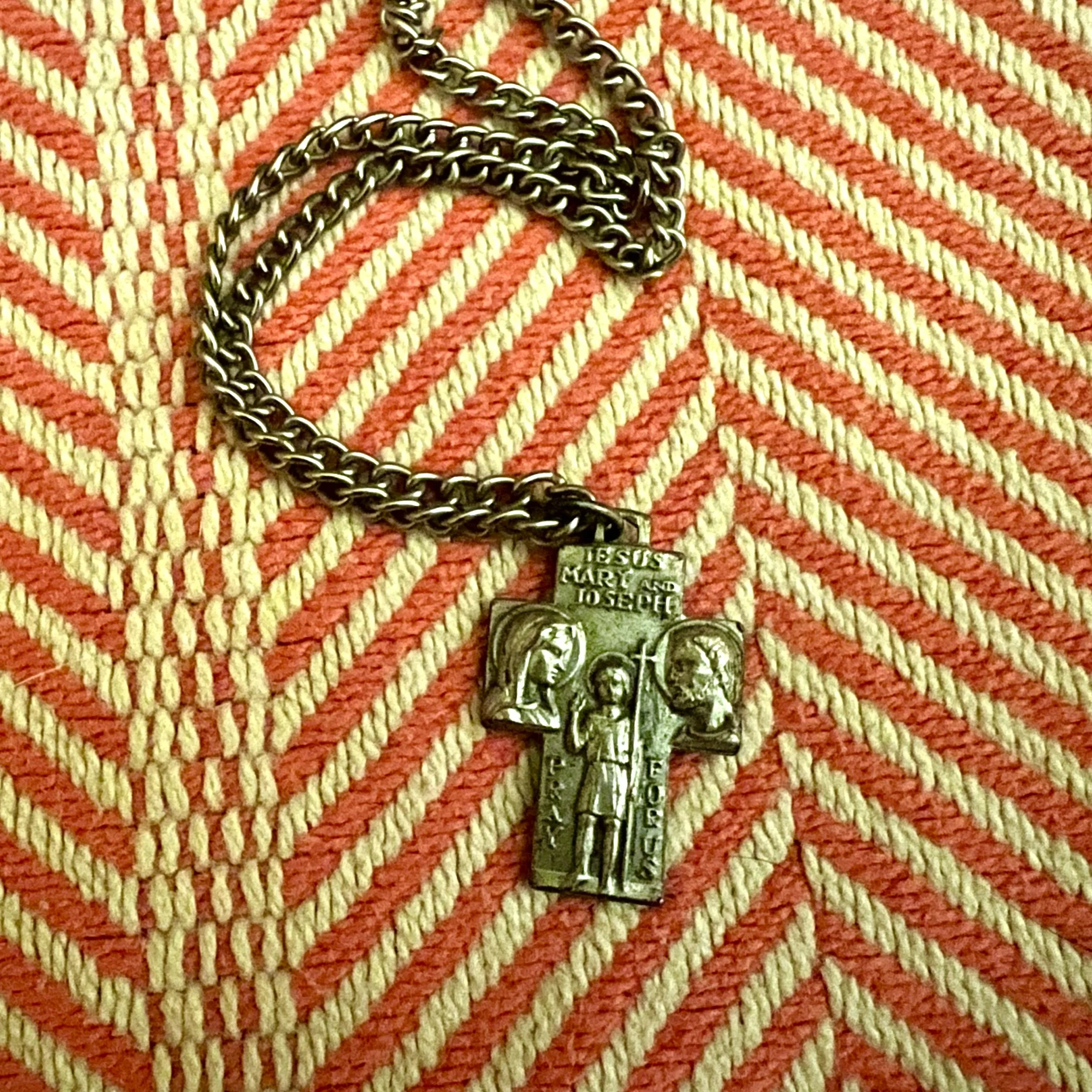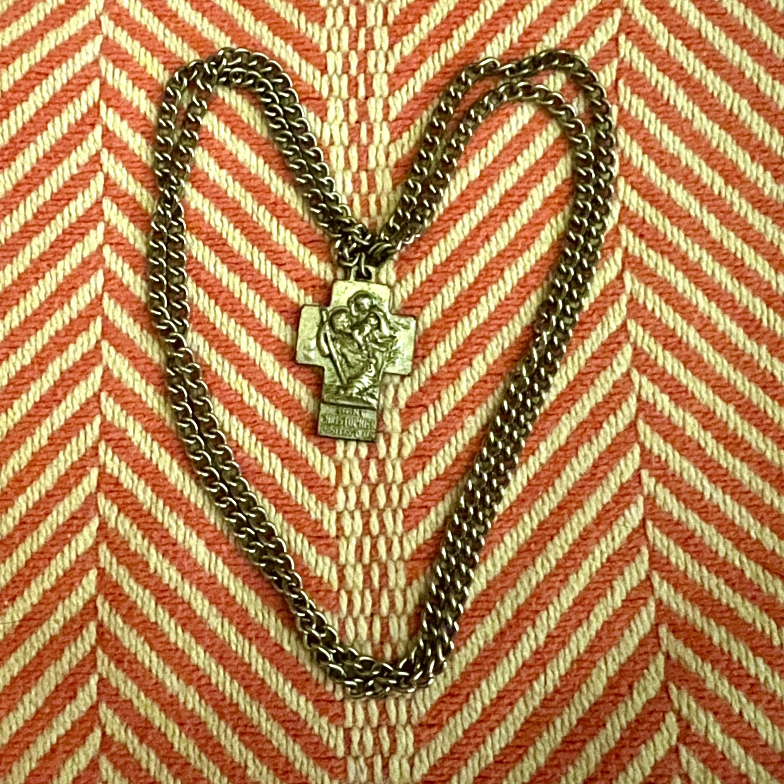 1960s vintage St. Christopher pendant with the Holy Family on the reverse. Over the head chain with no clasp. 13 in. drop length