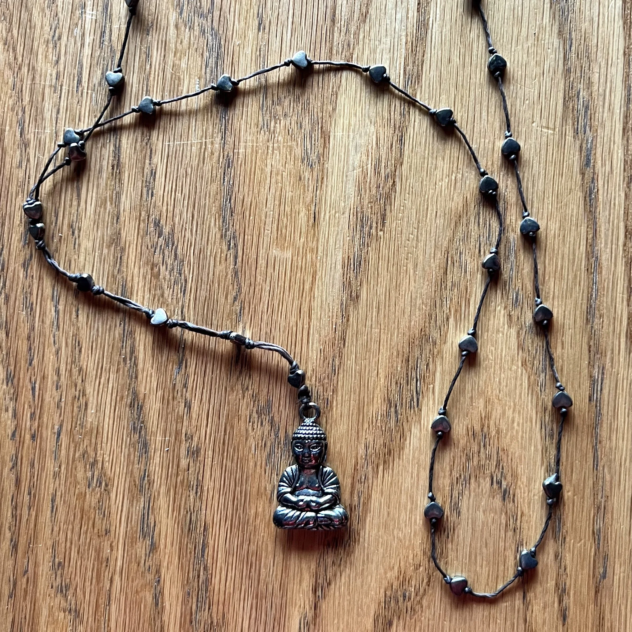 Likely 90s vintage. Long necklace on black cording with silver tone Buddha pendant and small gunmetal gray heart beads secured with knotting. 21.75 in. drop length