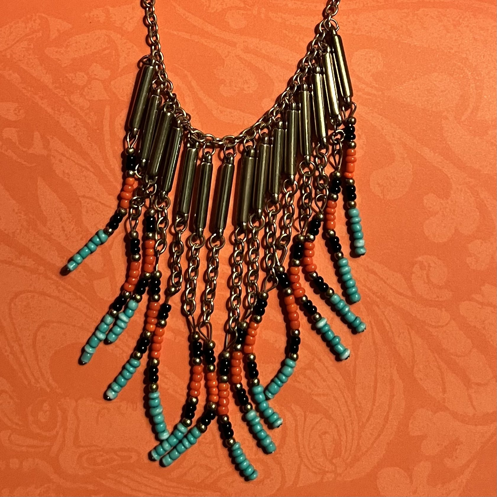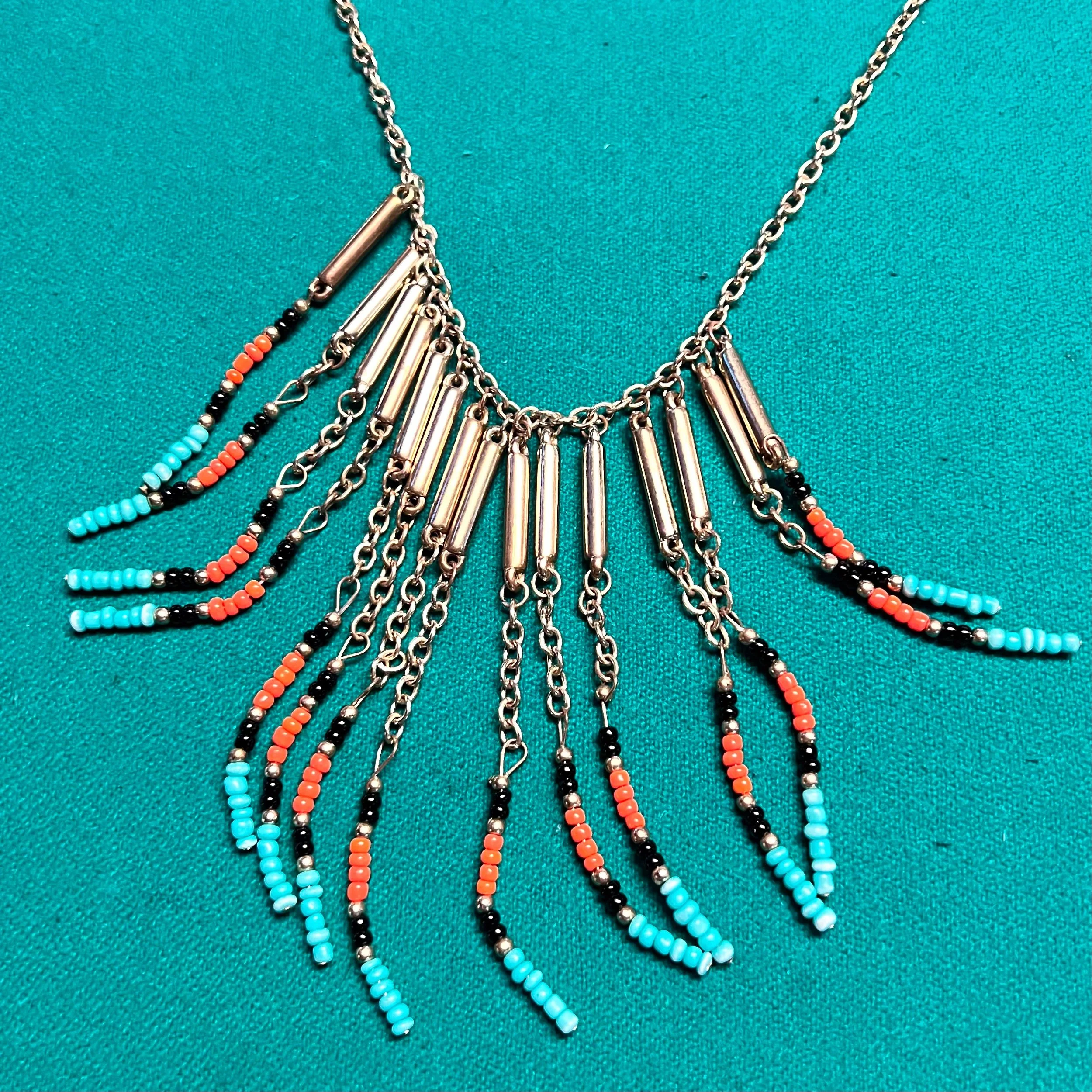 Gold tone beaded fringe necklace with adjustable length. Adorned with orange, black, and teal seed beads. Approx. 13 in. drop length