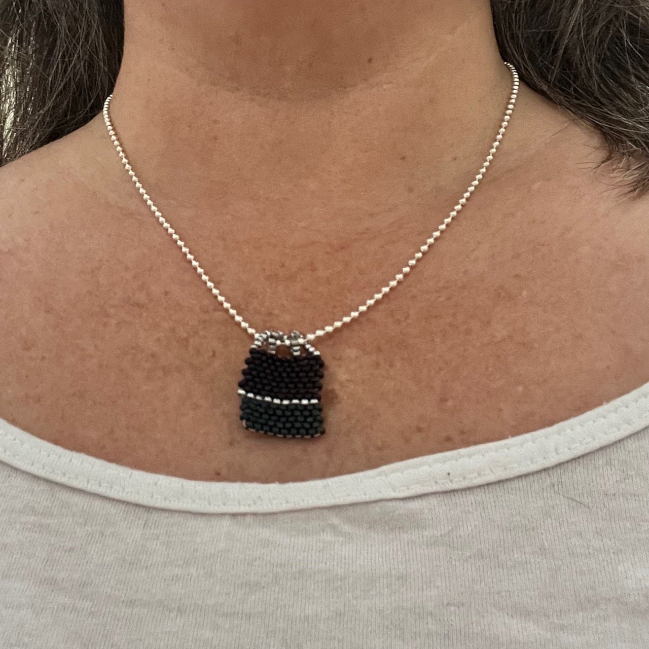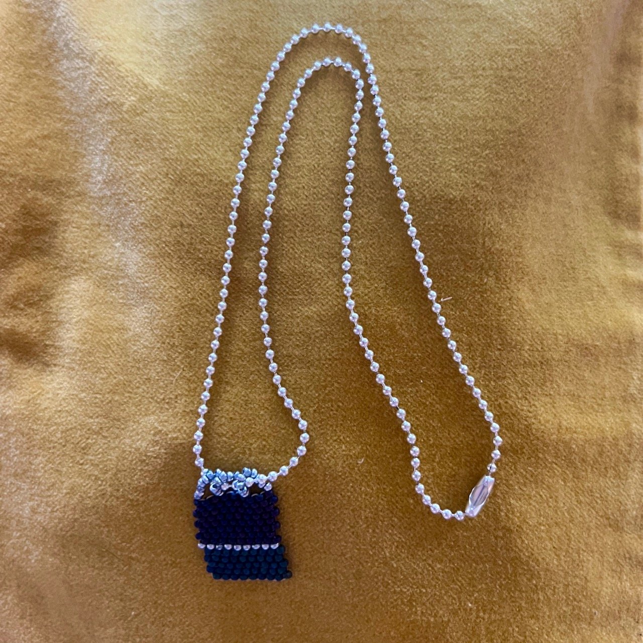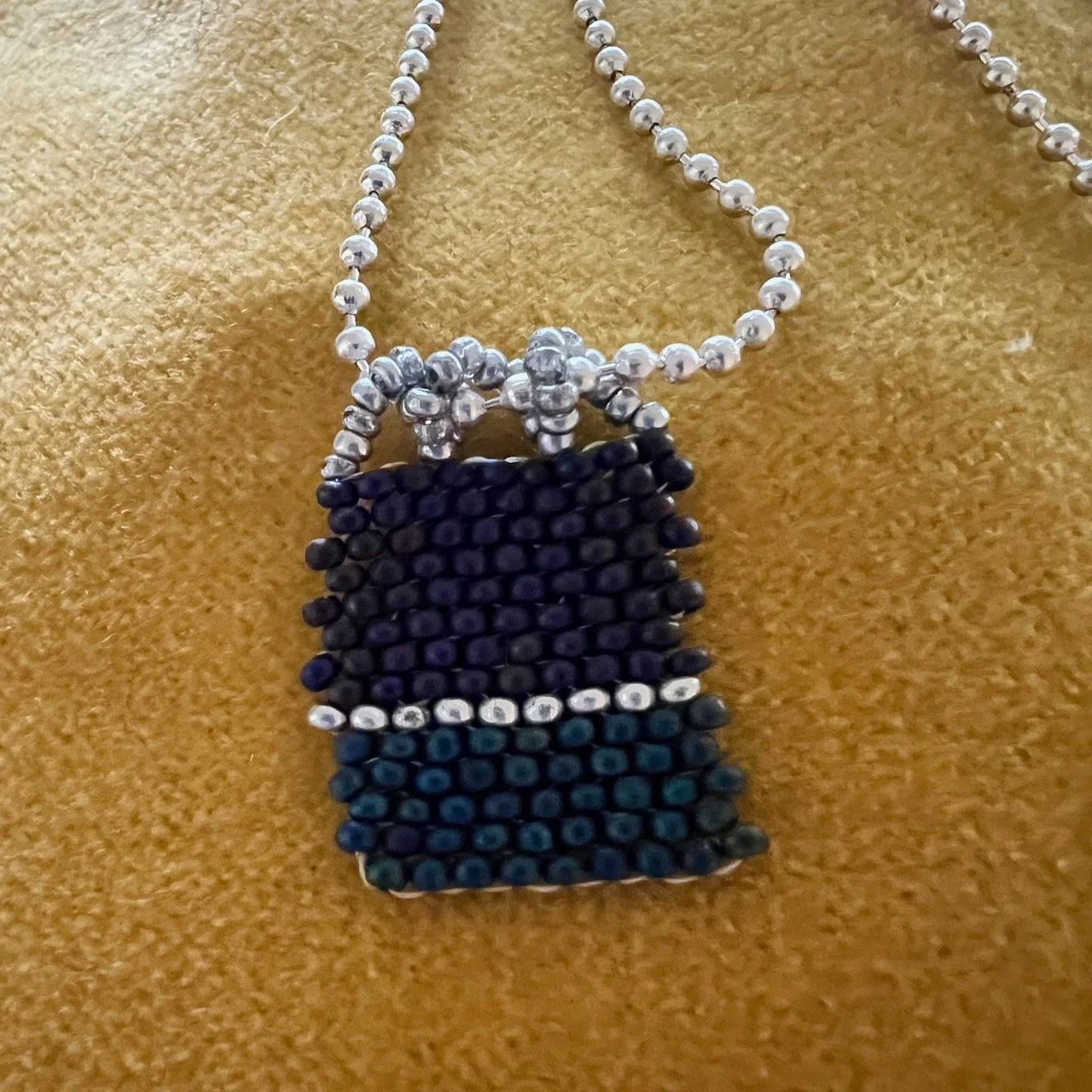 details: peyote stitch seed bead banner pendant on silver tone ball chain - pendant is navy blue with a single matte silver stripe