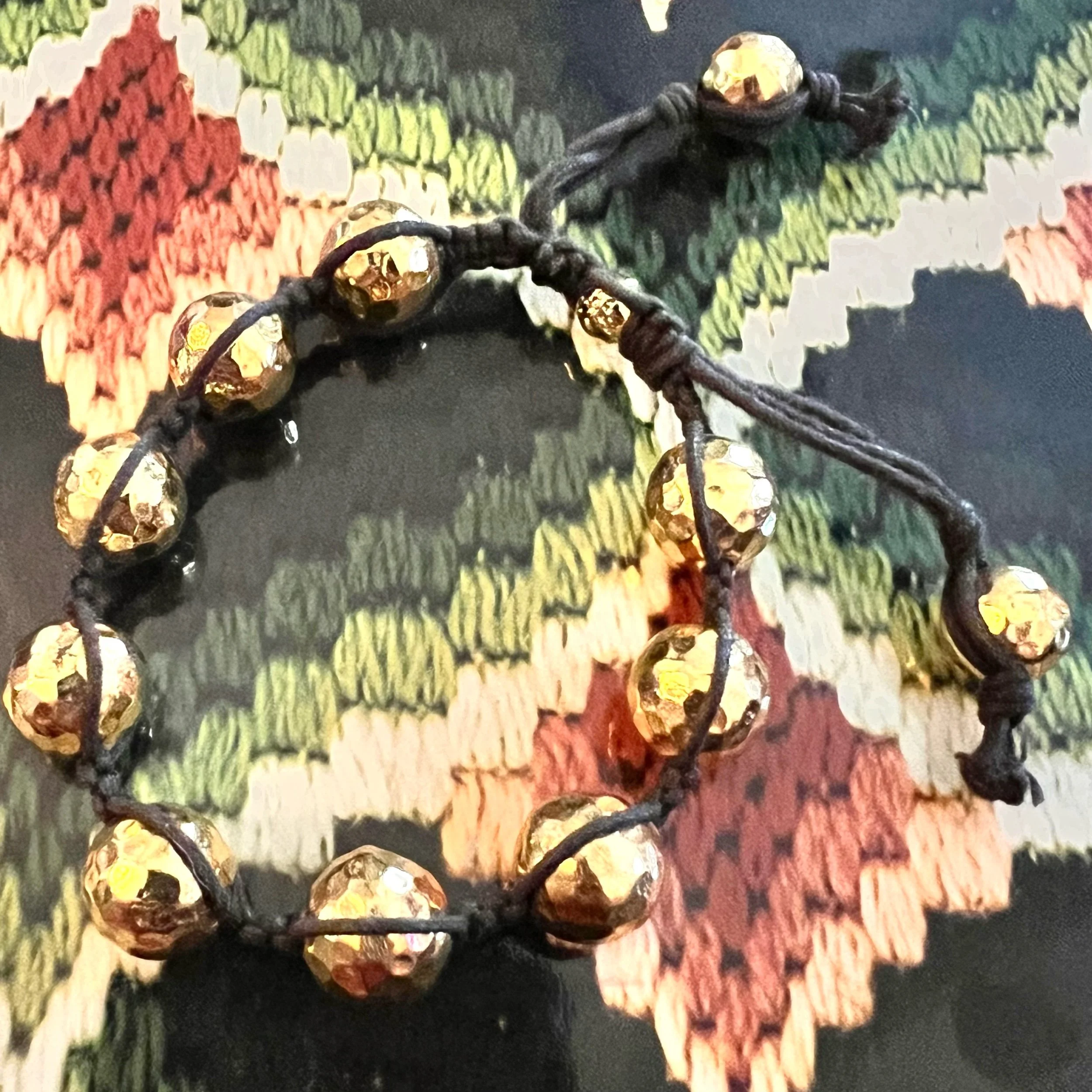 Likely 90s vintage, based on the original owner’s collection. Hammered gold tone sturdy beads on black knotted cording with an adjustable length. Very well made.