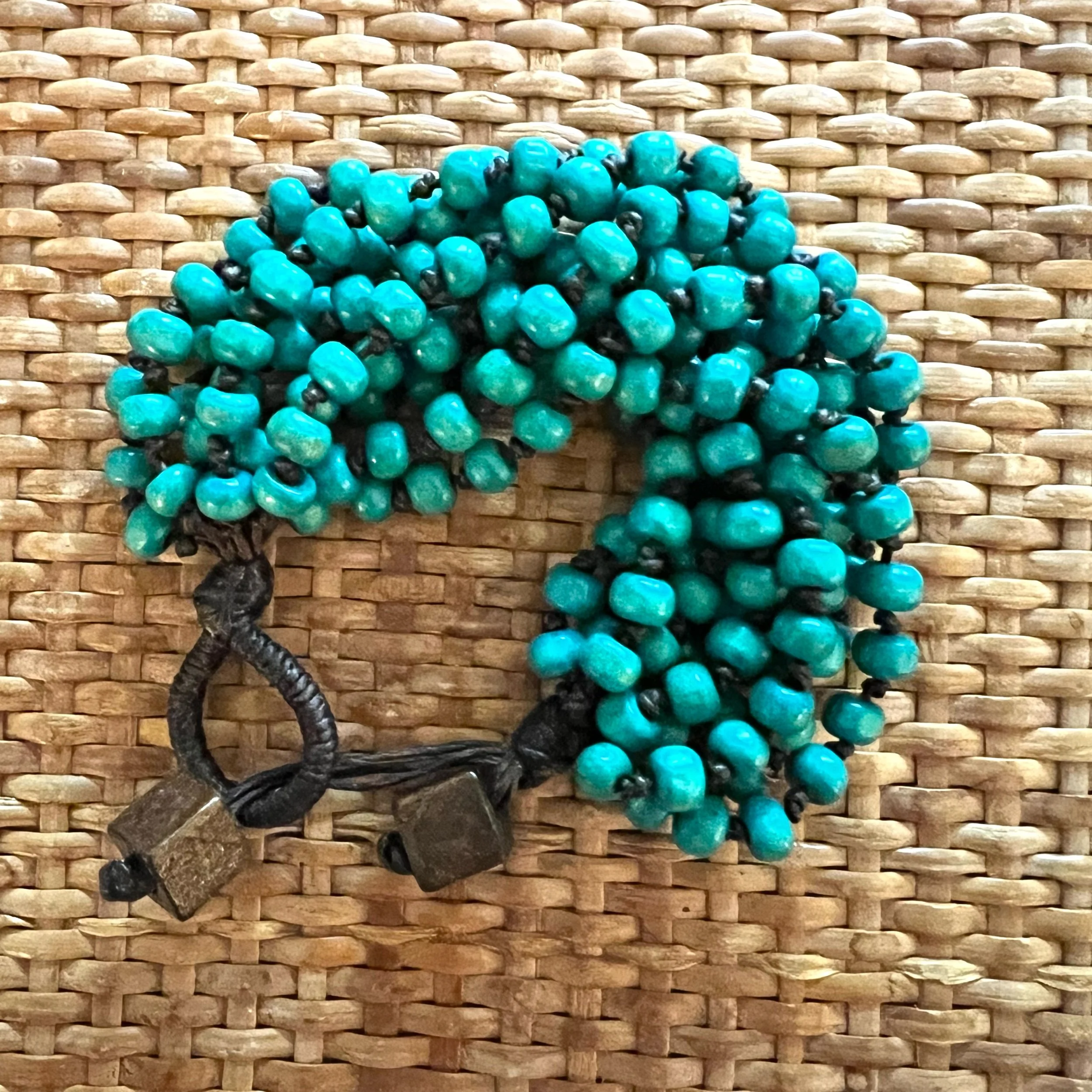 Multiple strands of teal beads knotted on dark brown cording with decorative wooden square beads for the clasp. Likely 90s vintage based on the original owner’s collection.